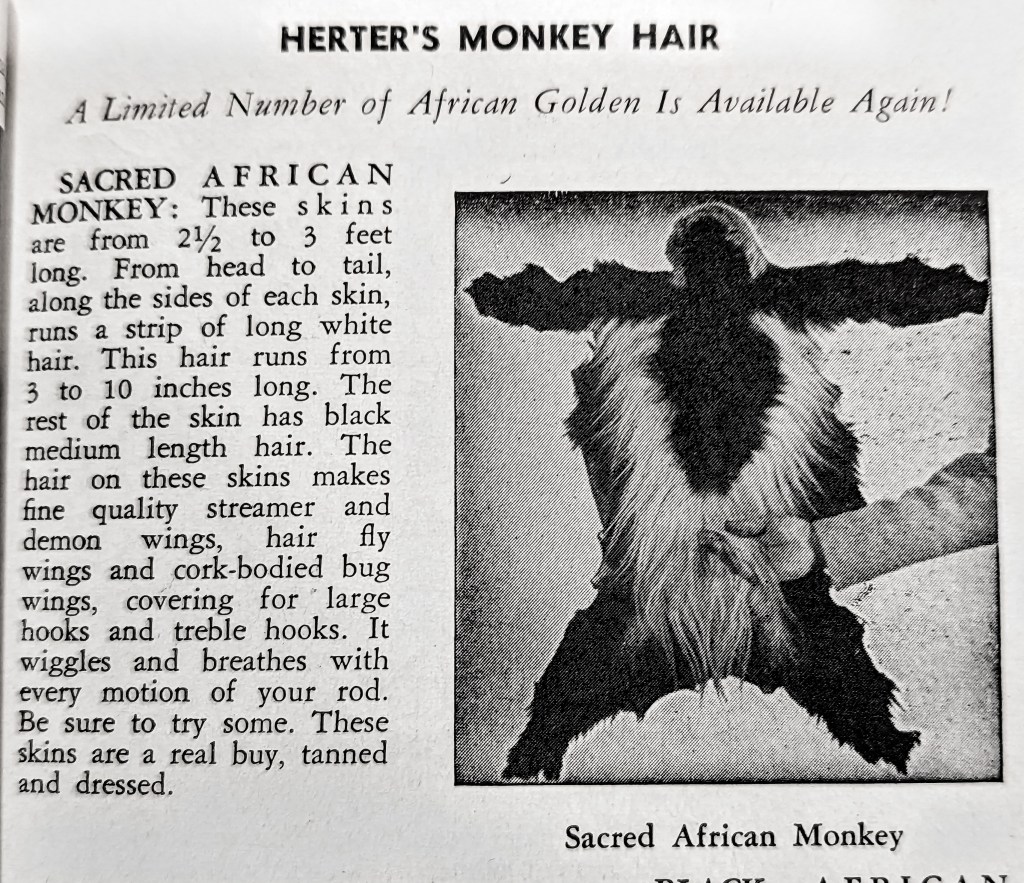 Every new fly recipe I try requires some odd material that I don’t have. I get it online when possible but there are just some things that are no longer sold anywhere. In the 1950s, the mail-order outdoor goods catalogue Herter’s sold Sacred African Monkey Skins (SAMS). I am amazed and saddened by what people killed and sold in the name of fly-tying and it makes me sick to think about all the animals that died so their skins could be sold for three dollars.