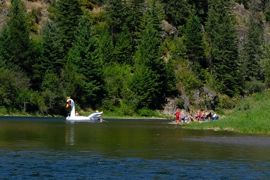 As the boat drifted through the bend, I stopped in mid-cast. My fly line piled up around my feet. Right in the middle of the river, what looked like a pagan ritual was taking place, as a number of kids and parents bowed down to the largest pool toy I had ever seen. People were climbing all over a fifteen-foot, inflatable, white swan anchored in the river. Okay, so maybe they weren’t bowing down to it, but they were bouncing on it, yelling and screaming and jumping into the premier freestone river in Idaho. Birds circled the swan as if drawn to it by their new goddess.